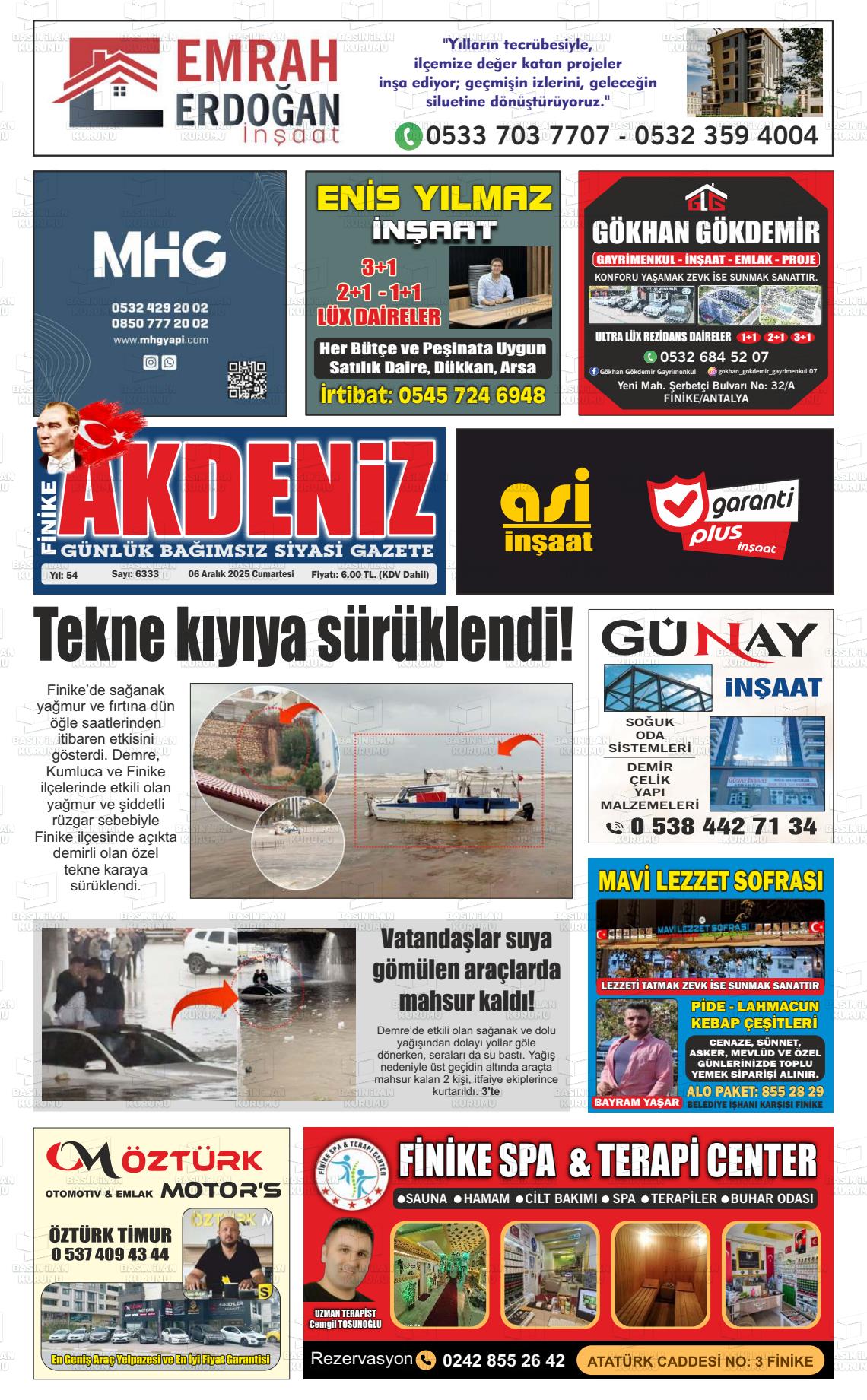 Antalya Yerel Gazeteleri 06 Aralık 2025, Cumartesi Günü Manşeti